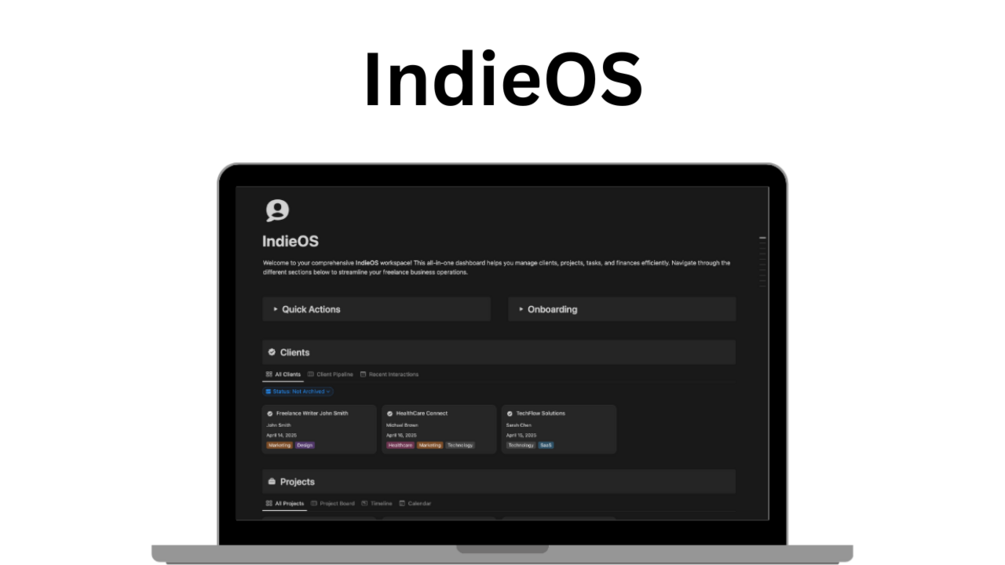 IndieOS is a high-performance Notion workspace built for modern freelancers who want to run operations like pros — without duct-taping together spreadsheets, sticky notes, and random Slack pings.
